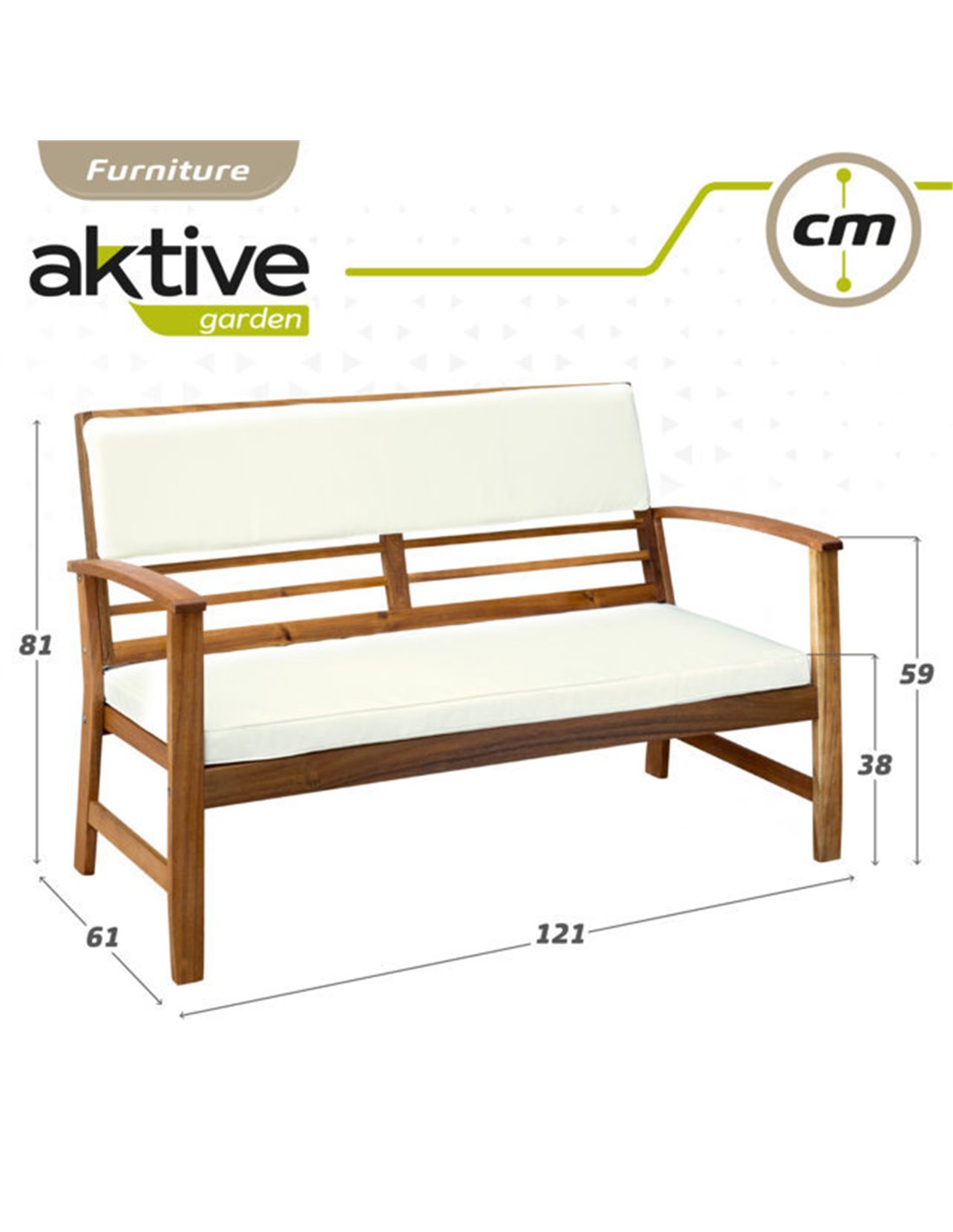 Conjunto de muebles de jardín Aktive Garden con mesa, banco y sillones. Son demadera de Acacia proveniente de bosques sostenibles. El acabado en aceite protege la madera y resalta su color y veta natural. Para uso exterior, el banco doble y los 2 sillones tienen el respaldo acolchado e incluyen cojines color crudo. Medidas mesa: 75x51x34 cm, sillones: 60x61x81 cm y banco: 121x61x81 cm.